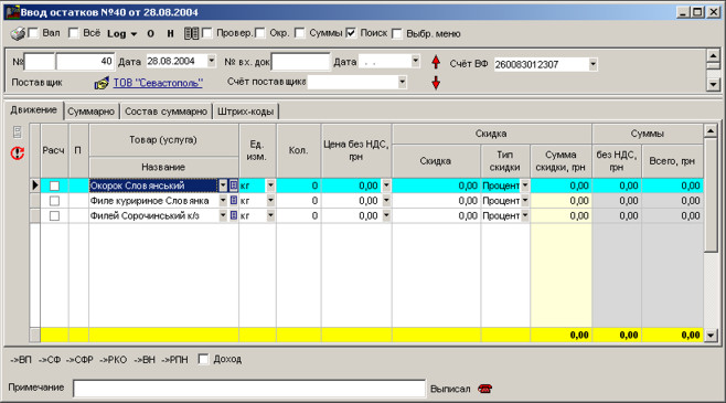 Щоб створити документ для введення залишків, натисніть кнопку F4. На екрані з'явиться вікно створення документа.