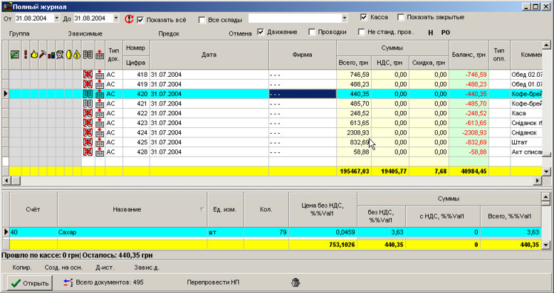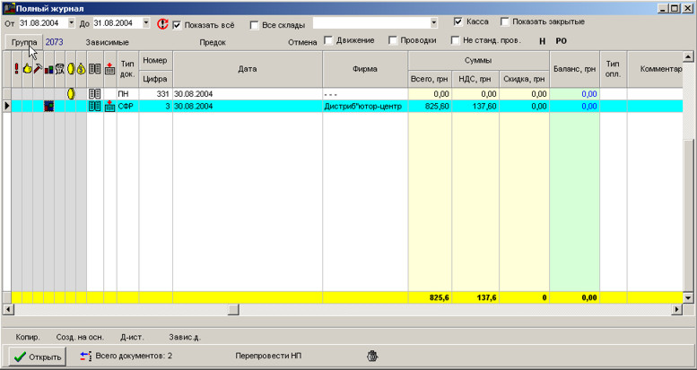 Повний журнал призначений для перегляду існуючих документів, завантаження їх, видалення, а також створення документів на підставі.