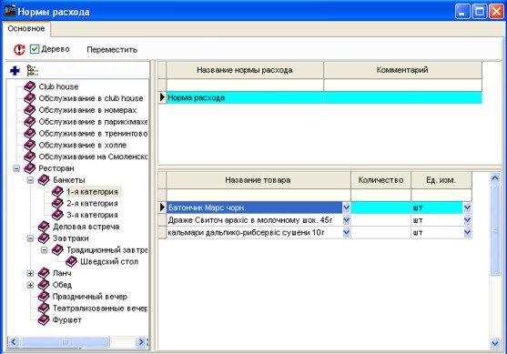 Праворуч ви можете формувати дерево норм витрати. Праворуч створювати групи норм (у верхній таблиці) та їх вміст (у нижній таблиці).