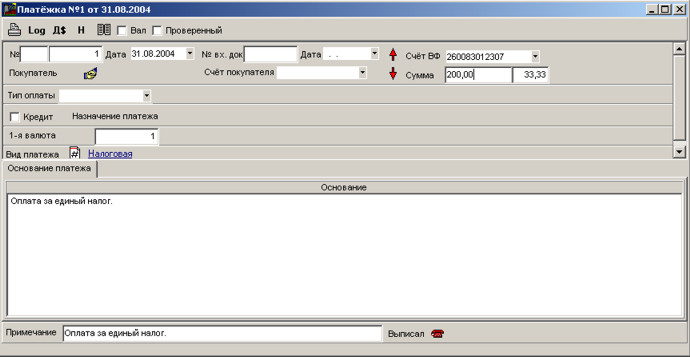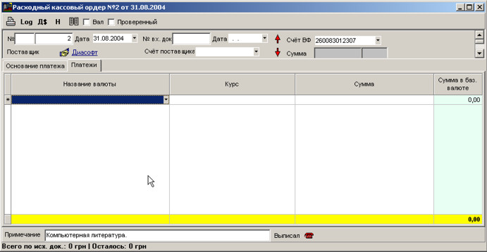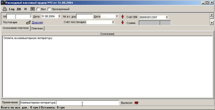У програмі виконується облік платежів з допомогою кількох документів: видатковий касовий ордер, прибутковий касовий ордер, платіжка.