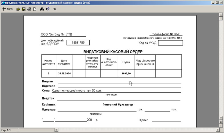 Для друку видаткового касового ордера натисніть кнопку .