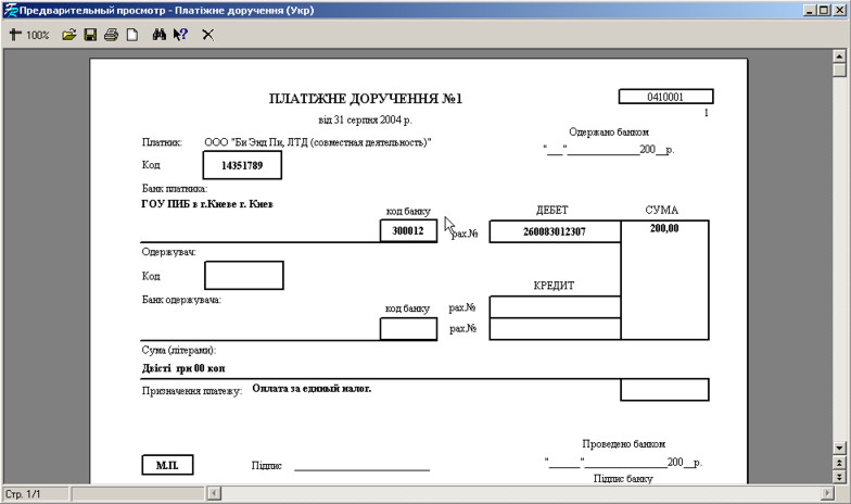 Щоб вивести платіжку на принтер, натисніть кнопку .