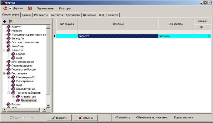 Виберіть фірму в довіднику фірм та натисніть кнопку Вибрати для вставки у документ.