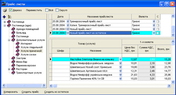 Праворуч Ви бачите дві таблиці. Верхня таблиця - це список прайс-листів у вибраній галузі дерева, а знизу - самі рядки прайс-листів.