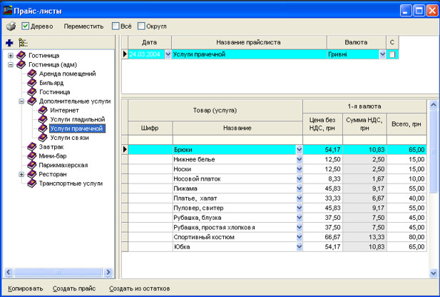 Прайс-листи можна копіювати, видаляти створювати із залишків або довідника активів.