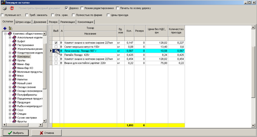 Знизу вікна пишуться поточні залишки та прибуткова ціна товару.