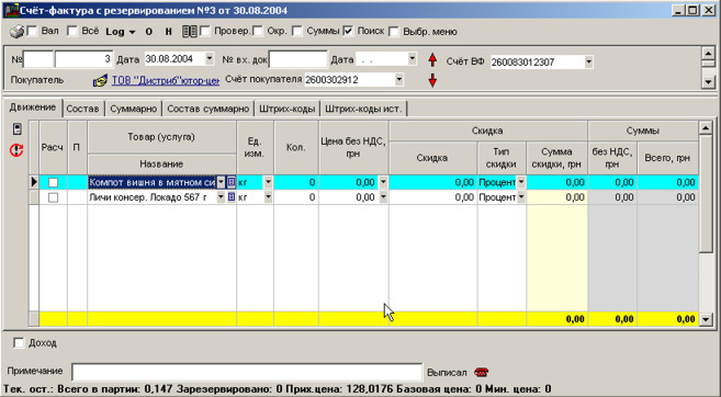 Знизу вікна пишуться поточні залишки та прибуткова ціна товару.