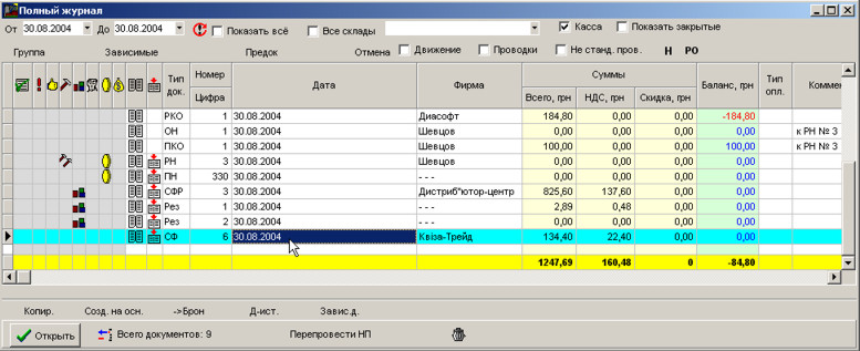 Рахунок-фактура зазначається у повному журналі літерами СФ. Підведіть курсор та натисніть Відкрити або двічі клацніть лівою кнопкою миші на рядку.