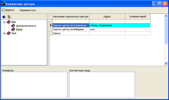 Праворуч таблиця сервісних центрів. Ви можете вказати основну інформацію по сервісних центрах: назва, адреса, коментар, телефони, а також контактні особи.