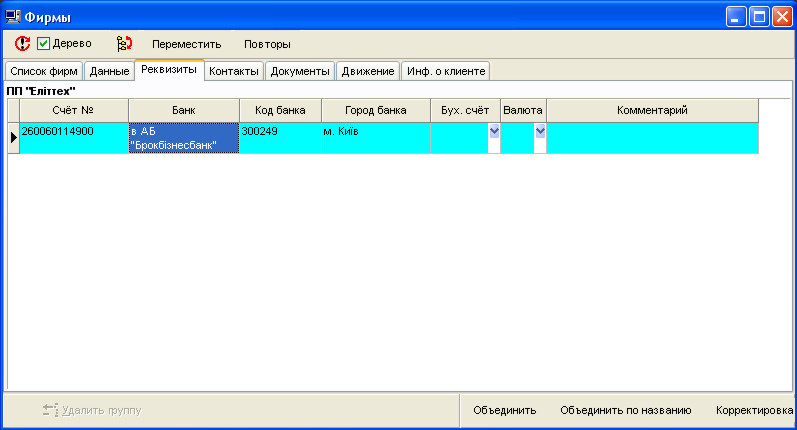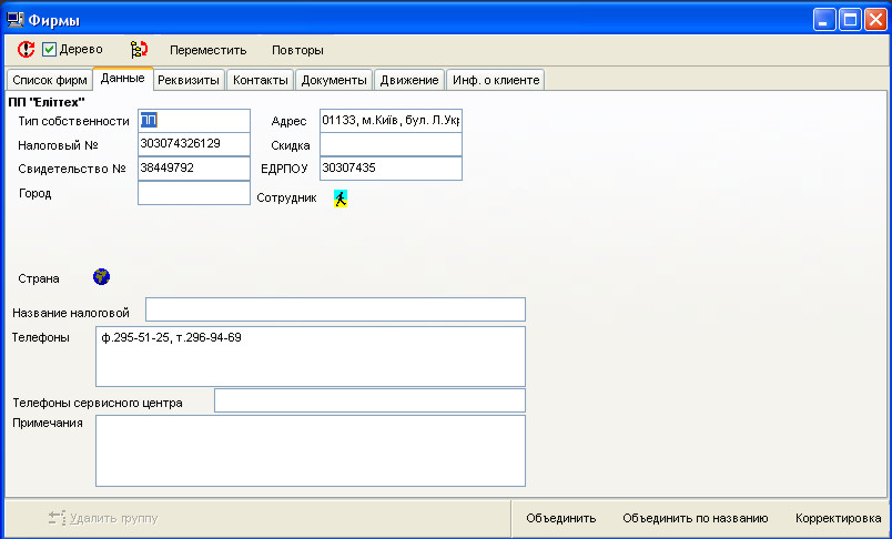 У процесі формування довідника користувачі можуть випадково запровадити ту саму фірму кілька разів. У програмі передбачені команди для виправлення таких помилок. Докладніше читайте у розділі Об'єднання фірм та виправлення помилок.