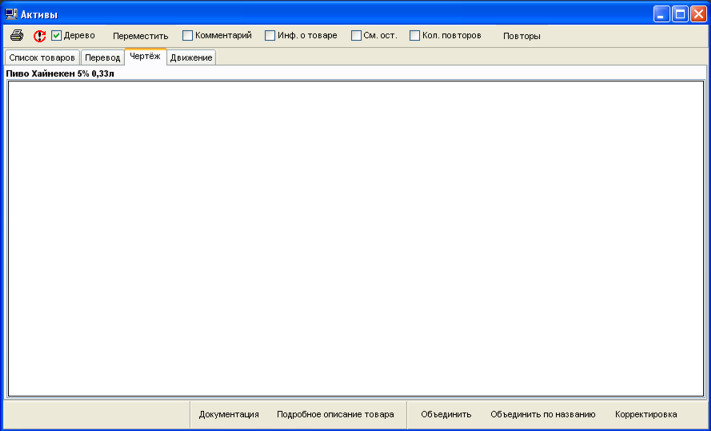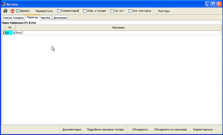 У довіднику активів зазначаються всі найменування товарів різними мовами, послуг, продукції, а також їх характеристики: тип товару, одиниці виміру, місцезнаходження за умовчанням, базова ціна, креслення, націнки і т.д.