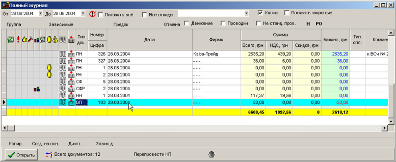 Накладну на внутрішнє переміщення можна завантажити з повного журналу. Для виклику повного журналу натисніть F5. Накладні на внутрішнє переміщення позначаються у повному журналі літерами ВП.