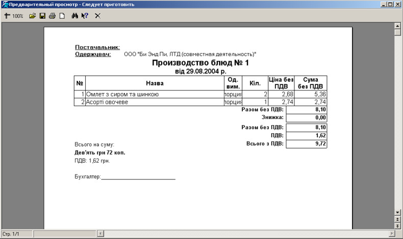 Тут на відміну від акта списання програмі немає необхідності вибирати партії для списування, тому програма сама розраховує склад і вартість продукції.
