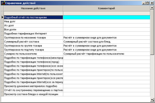 Іноді перед виконанням звіту необхідно програмі виконати деякі дії. Ці дії прописуються у довіднику дій. Щоб запустити довідник дій, виконайте команду меню Адміністрація-> Налаштування звітів-> Довідник дій.