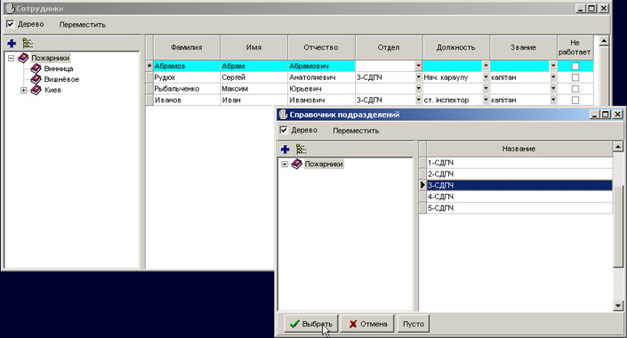 Щоб додати нового учня, натисніть на кнопці Insert. Введіть прізвище, ім'я та звіт. Щоб вибрати відділ, посаду або звання, натисніть на кнопці для виклику відповідного довідника. Виберіть інформацію з довідника та натисніть на кнопку Вибрати.