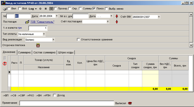 Щоб створити документ для введення залишків, натисніть кнопку F4. На екрані з'явиться вікно створення документа.