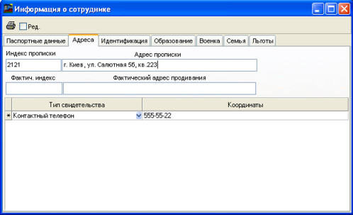Для вказівки адрес проживання, прописки та контактних координат призначена закладка Адреси.