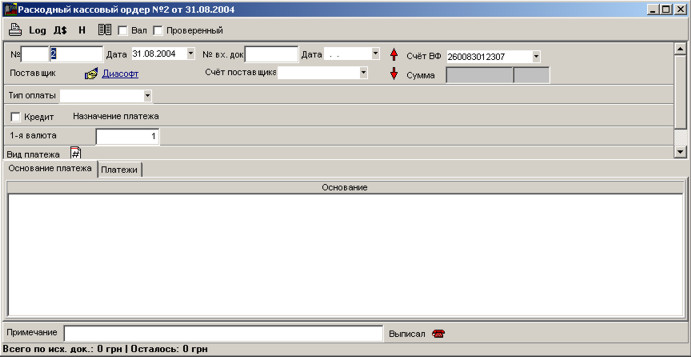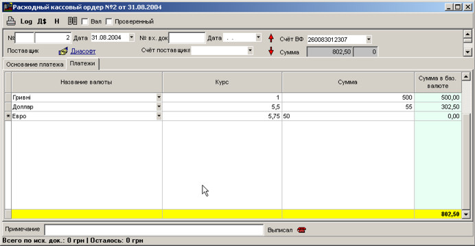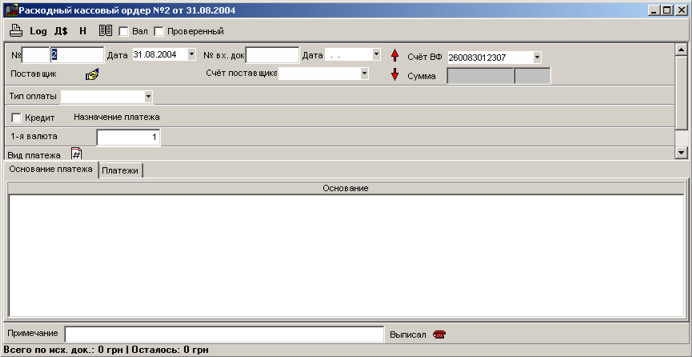 У програмі виконується облік платежів з допомогою кількох документів: видатковий касовий ордер, прибутковий касовий ордер, платіжка.