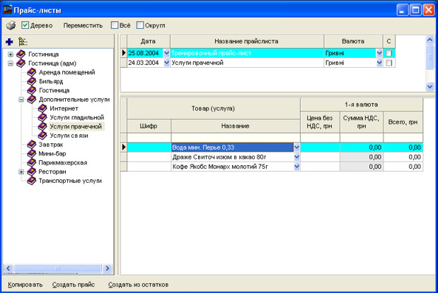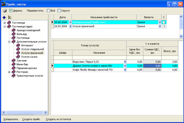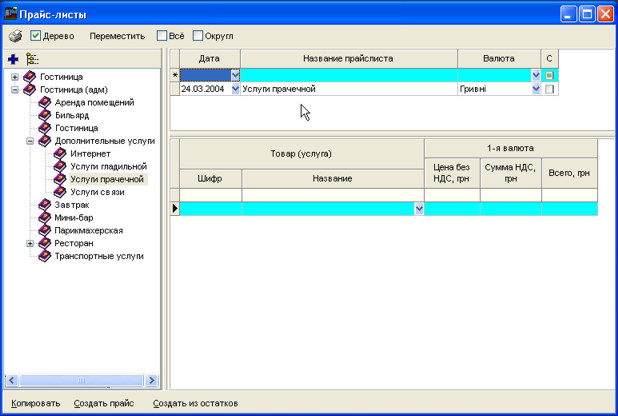 Праворуч Ви бачите дві таблиці. Верхня таблиця - це список прайс-листів у вибраній галузі дерева, а знизу - самі рядки прайс-листів.