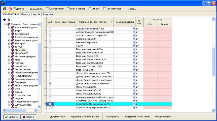 Щоб вставити новий рядок, натисніть Insert. Підведіть курсор миші до кнопки списку у стовпці Назва та натисніть ліву кнопку. На екран виведеться довідник автивів (товарів та послуг). Виберіть у цьому довіднику товари або послуги, які Ви бажаєте вставити в прайс-лист і натисніть кнопку Вибрати.
