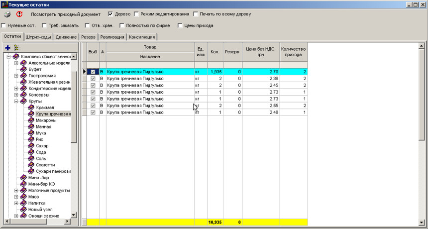 Знизу вікна пишуться поточні залишки та прибуткова ціна товару.