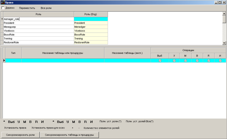 Повн. вуст. ролі (*) - синхронізує всі таблиці та процедури в таблиці ролей, вказує скрізь галочки в таблицях та процедурах, створює роль на сервері бази даних Interbase (Firebird) та визначає права для доступу до таблиць та збережених процедур на рівні бази даних Interbase (Firebird). Ця команда виконується для поточної ролі.