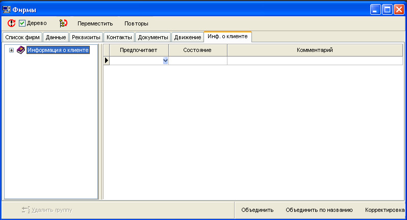 На закладці Список фірм Ви можете вибрати, ввести чи видалити фірму. У лівій частині Ви бачите дерево фірм. Це дерево Ви можете сформувати на свій розсуд. Наприклад, можна розділяти фірми за регіональним принципом. Докладніше, як працювати з деревом Ви можете прочитати з розділу Робота з деревом.