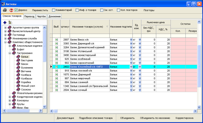 У довіднику активів зазначаються всі найменування товарів різними мовами, послуг, продукції, а також їх характеристики: тип товару, одиниці виміру, місцезнаходження за умовчанням, базова ціна, креслення, націнки і т.д.