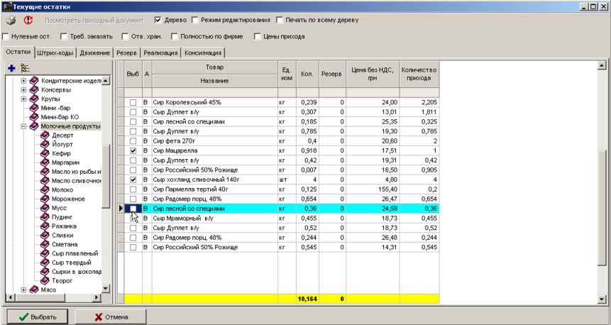 Виберіть товари та натисніть кнопку Вибрати для вставки у документ.