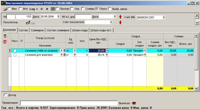 Внизу вікна показуються поточні залишки, а також прибуткова ціна.