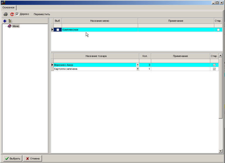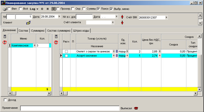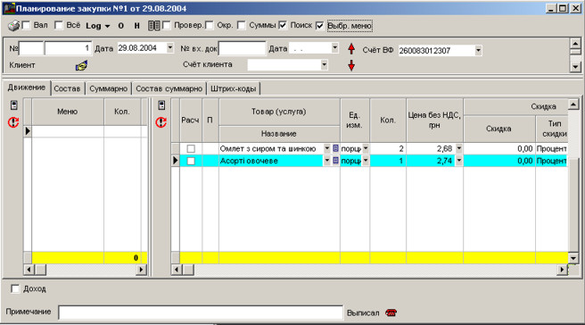 Для того, щоб формувати замовлення по меню, позначте галочку. Вибрати. Меню. Зліва у вікні з'явиться таблиця введення меню.