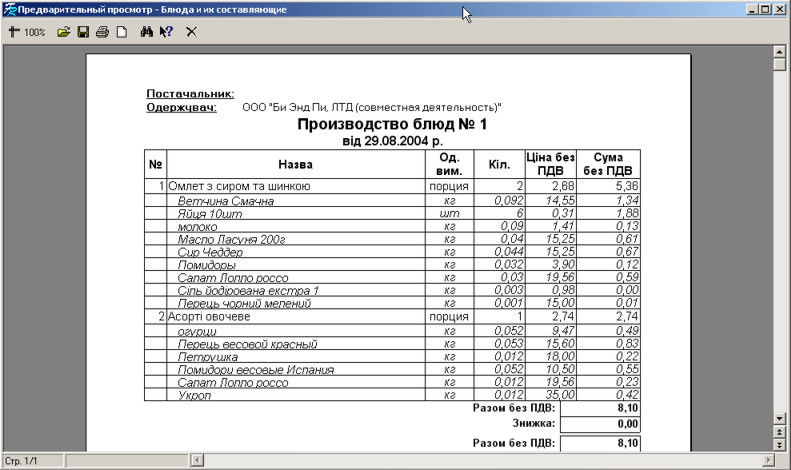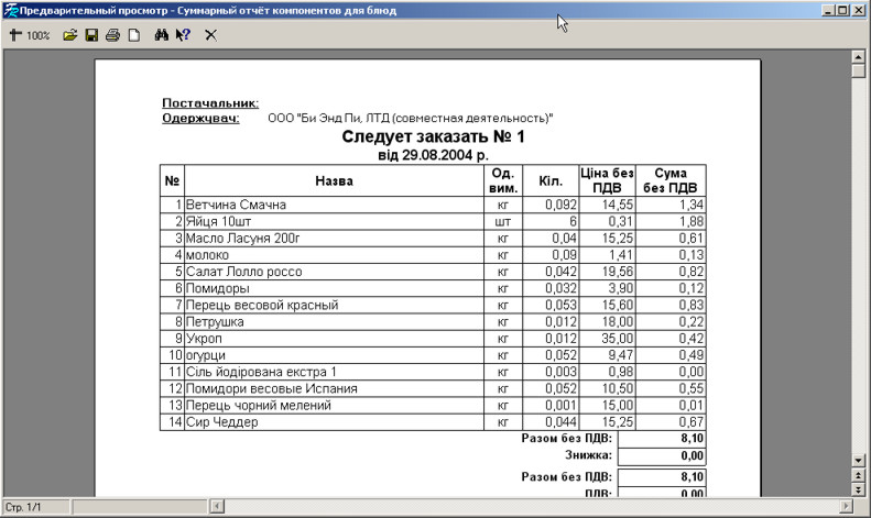 - Сумарний звіт компонентів страв. Друкуються лише складові у групованому вигляді.